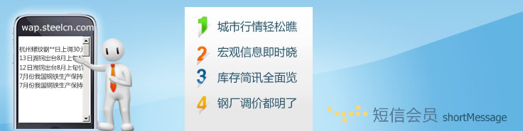 目前中鋼網手機短信能給用戶提供:每日全國各主要城市的板材、建材、管材、型材、鐵礦石、鋼坯、生鐵、廢鋼、進口礦等行情短信信息,每日市場分析、熱點新聞分析、行情匯總信息、鋼廠調價、現貨供應、現貨庫存、求購信息、鋼材期貨信息等九大分類信息,為商家提供全面的信息支持。